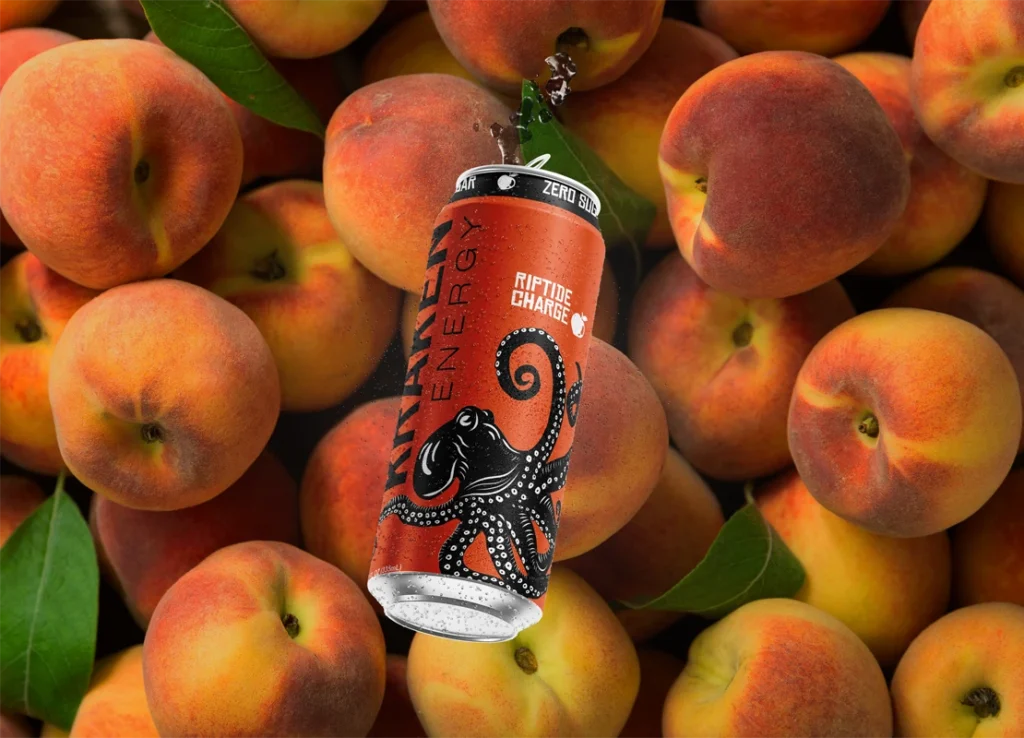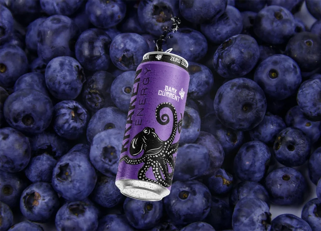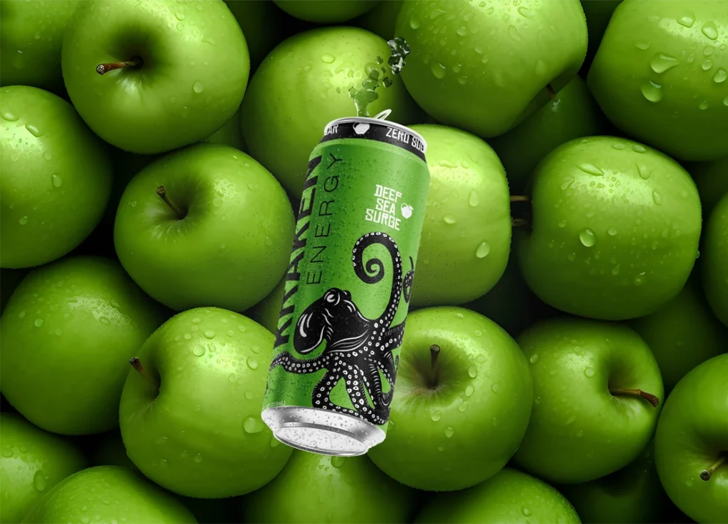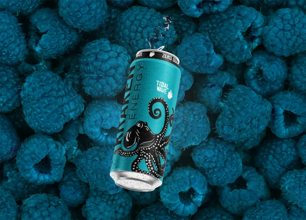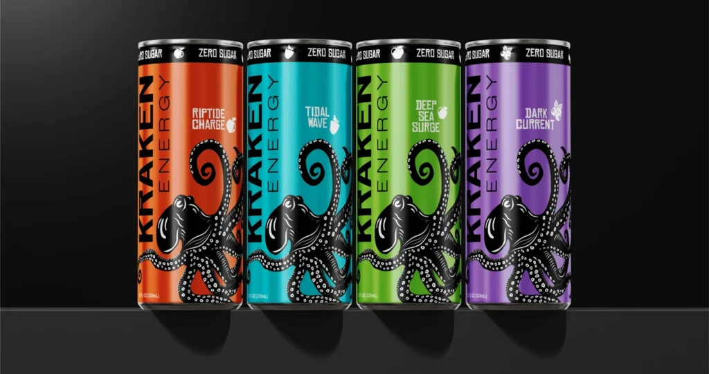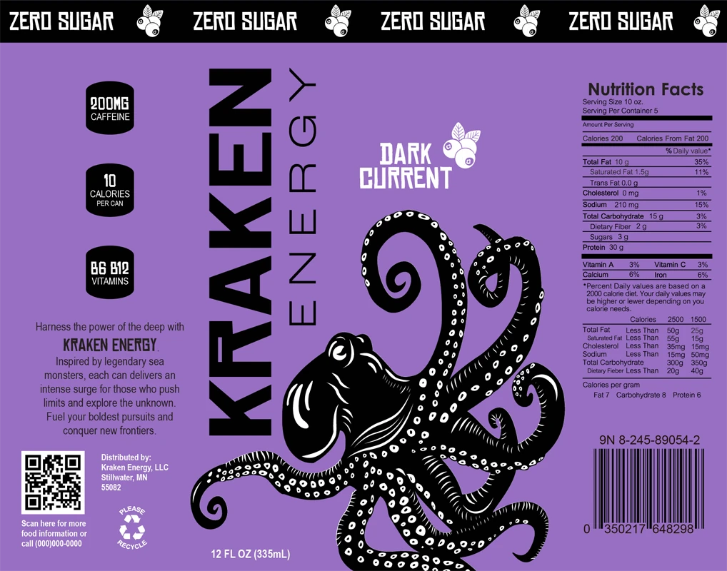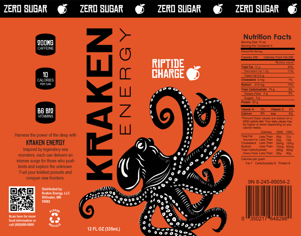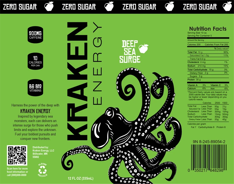 Kraken Energy is a conceptual brand developed for an energy drink targeting young adults. The label is built around a stylized kraken illustration that wraps the full 360-degree surface of the can, creating movement that guides the viewer around the packaging.