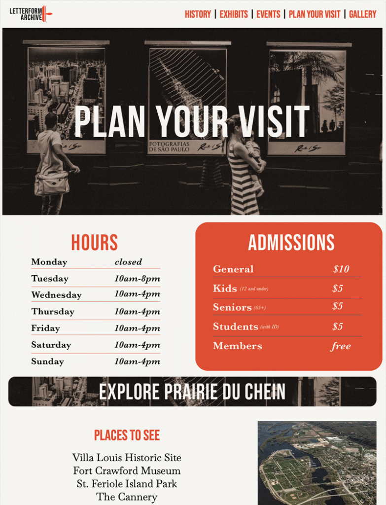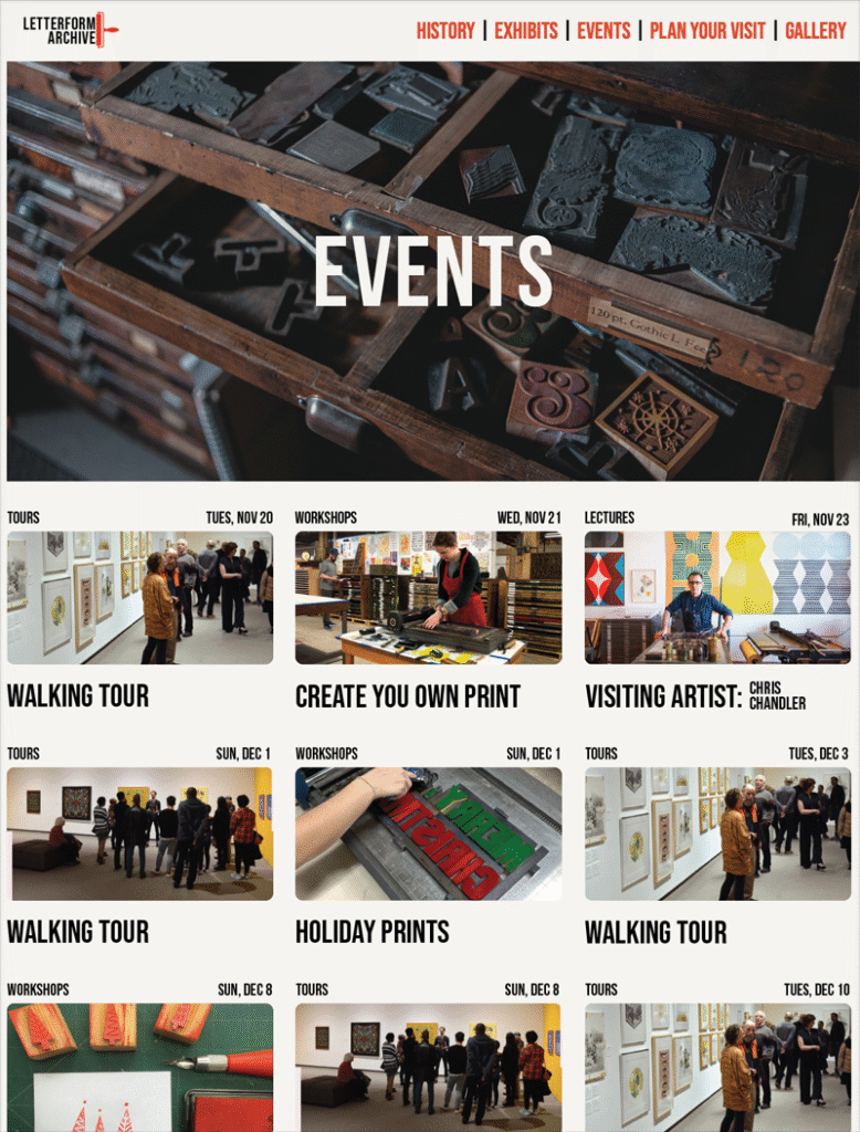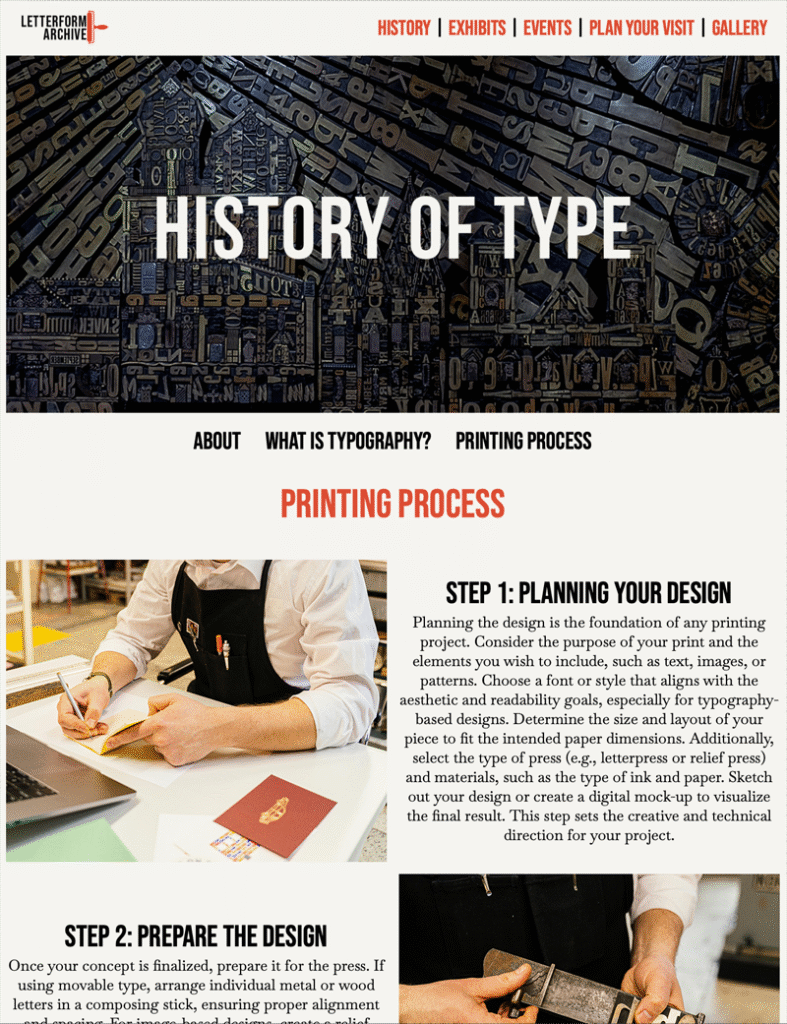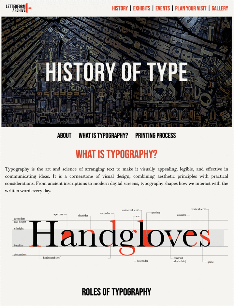 The Letterform Archive is a multi-page HTML and CSS website designed as a conceptual digital museum dedicated to the history of typography and archival print. Built in Adobe Dreamweaver, every layout decision was made with accessibility and clarity in mind.